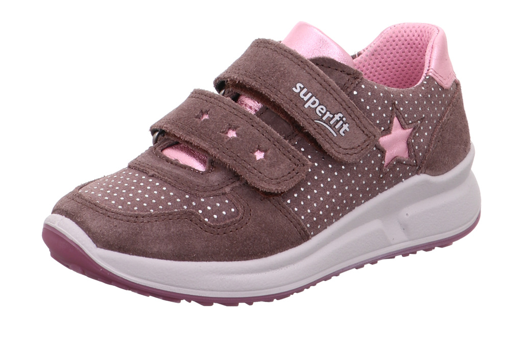 Der trendige Sneaker MERIDA von superfit ist ein cooler Begleiter für modebewusste Mädchen. Die Kombination aus Velours- und Effekteinsätzen mit verspielten Details wie Glitzersternen ist nicht nur optisch ein absoluter Hingucker, der Materialmix ist darüber hinaus auch sehr strapazierfähig. Atmungsaktives Textilfutter gewährt optimalen Klimakomfort im Schuh. Dank der praktischen Klettverschlüsse kann der Halbschuh für Kinder weit geöffnet und so rasch und unkompliziert an- bzw. ausgezogen werden. Die zweifärbige Laufsohle im lässigen "Runnerprofil" bietet optimalen Gehkomfort sowie beste Bodenhaftung. Die Einlegesohle ist bei diesem Modell herausnehmbar und kann jederzeit durch neue Einlagen ersetzt werden.